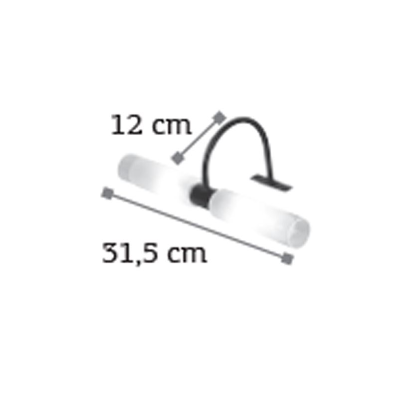 Πρόκειται για ένα επιτοίχιο φωτιστικό κατασκευασμένο από μέταλλο σε μαύρη απόχρωση με δύο λαμπτήρες που καλύπτονται από κυλινδρικό γυαλί αμμοβολής με διάφανες λεπτομέρειες. Είναι η ιδανική επιλογή για φωτισμό μπάνιου τοποθετημένο πάνω από τον καθρέπτη και όταν υπάρχει έλλειψη χώρου για την βάση του. Το φως διαχέεται ομοιόμορφα.  Πρόκειται για ένα επιτοίχιο φωτιστικό κατασκευασμένο από μέταλλο σε μαύρη απόχρωση με δύο λαμπτήρες που καλύπτονται από κυλινδρικό γυαλί αμμοβολής με διάφανες λεπτομέρειες. Είναι η ιδανική επιλογή για φωτισμό μπάνιου τοποθετημένο πάνω από τον καθρέπτη και όταν υπάρχει έλλειψη χώρου για την βάση του. Το φως διαχέεται ομοιόμορφα.