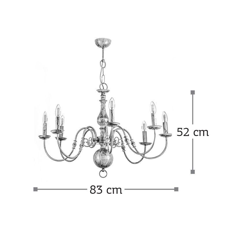 Πρόκειται για ένα κρεμαστό φωτιστικό από μέταλλο σε λευκή πατίνα με οχτώ λαμπτήρες. Κατάλληλο για διακόσμηση κλασσικών εσωτερικών χώρων. Η μεταλλική ανάρτηση είναι ρυθμιζόμενη για να προσαρμοστεί στον κάθε χώρο. Διατίθεται και λευκό υφασμάτινο καπέλο για πιο απαλό φωτισμό το οποίο θα πρέπει να ζητηθεί επιπλέον.  Πρόκειται για ένα κρεμαστό φωτιστικό από μέταλλο σε λευκή πατίνα με οχτώ λαμπτήρες. Κατάλληλο για διακόσμηση κλασσικών εσωτερικών χώρων. Η μεταλλική ανάρτηση είναι ρυθμιζόμενη για να προσαρμοστεί στον κάθε χώρο. Διατίθεται και λευκό υφασμάτινο καπέλο για πιο απαλό φωτισμό το οποίο θα πρέπει να ζητηθεί επιπλέον.