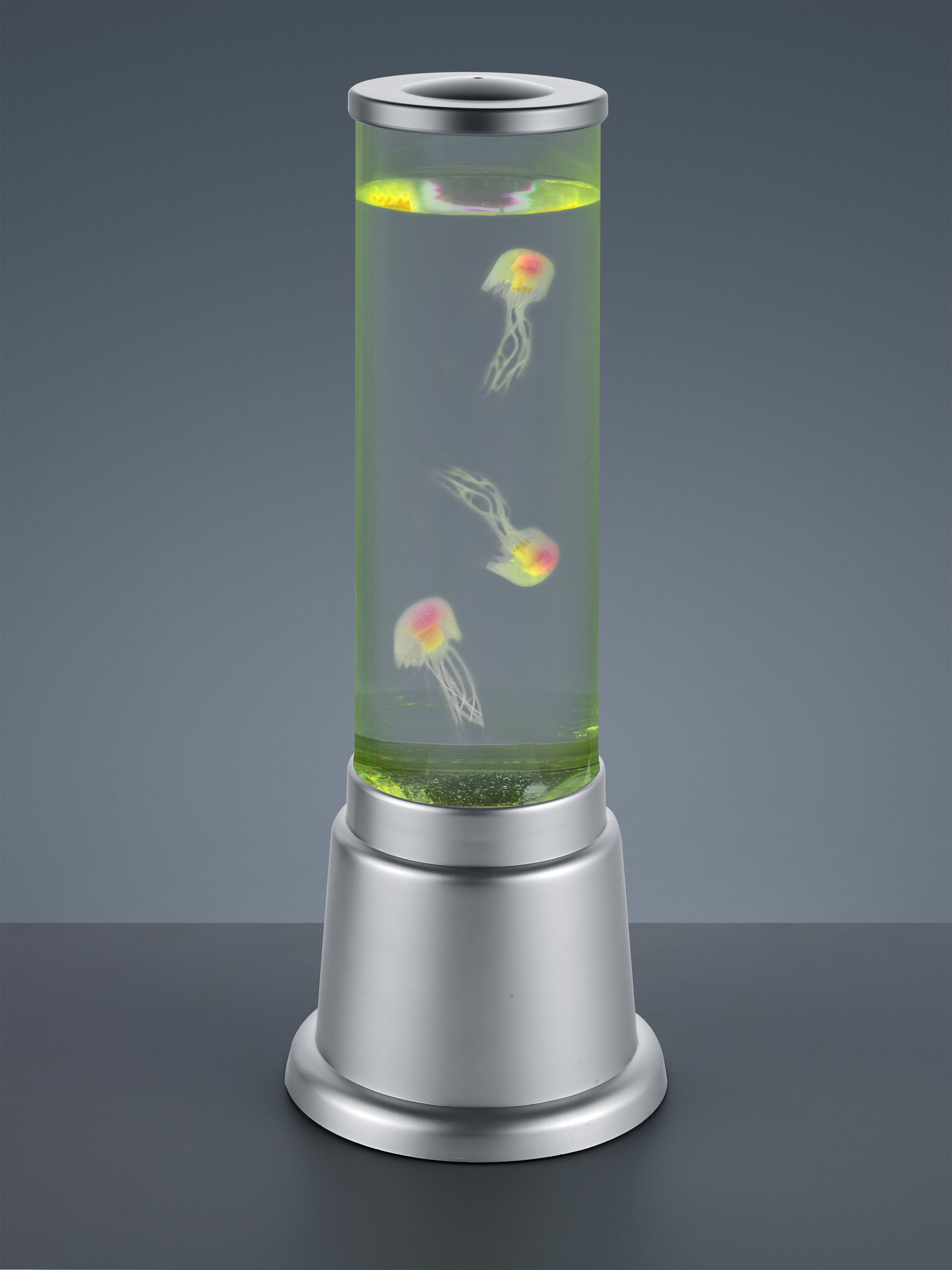 The JELLY LED water column - furnishing accessory and lighting in one. As soon as the column is switched on, the little jelly fish start to move in the clear liquid. The built-in RGB colour changer allows the column to take on different colours and conjures up a play of light in your living space. The water column sits on a titanium-coloured plastic base and has a height of 36 cm and a diameter of 12.5 cm.