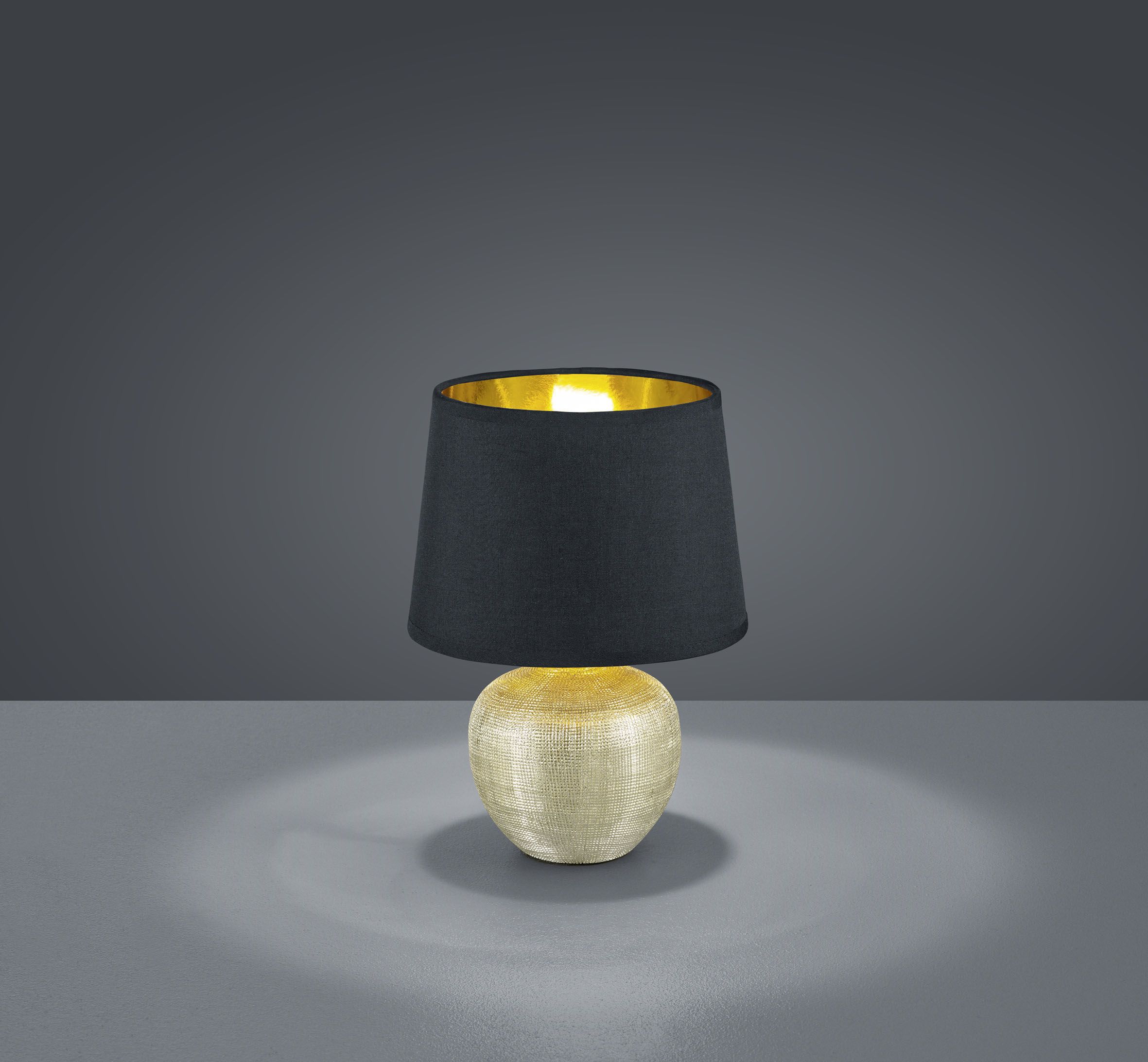 The elegant LUXOR table lamp quickly finds the right place, whether on the sideboard, in the hallway or in the bedroom as an accent light, the modern lamp is a real eye-catcher in any living area. The table lamp with cord switch has a diameter of 18 cm and a height of 26 cm. The gold-coloured ceramic base creates a pleasant ambience and harmonises perfectly with the black fabric shade, which is also gold-coloured on the inside. For energy-saving lighting, it is recommended to use an LED illuminant. These are an optimal alternative to conventional halogen lamps and stand for a high quality of light and energy savings of up to 80%. In addition, LED lamps help you benefit from a long service life, low heat generation and at the same time protect the environment.