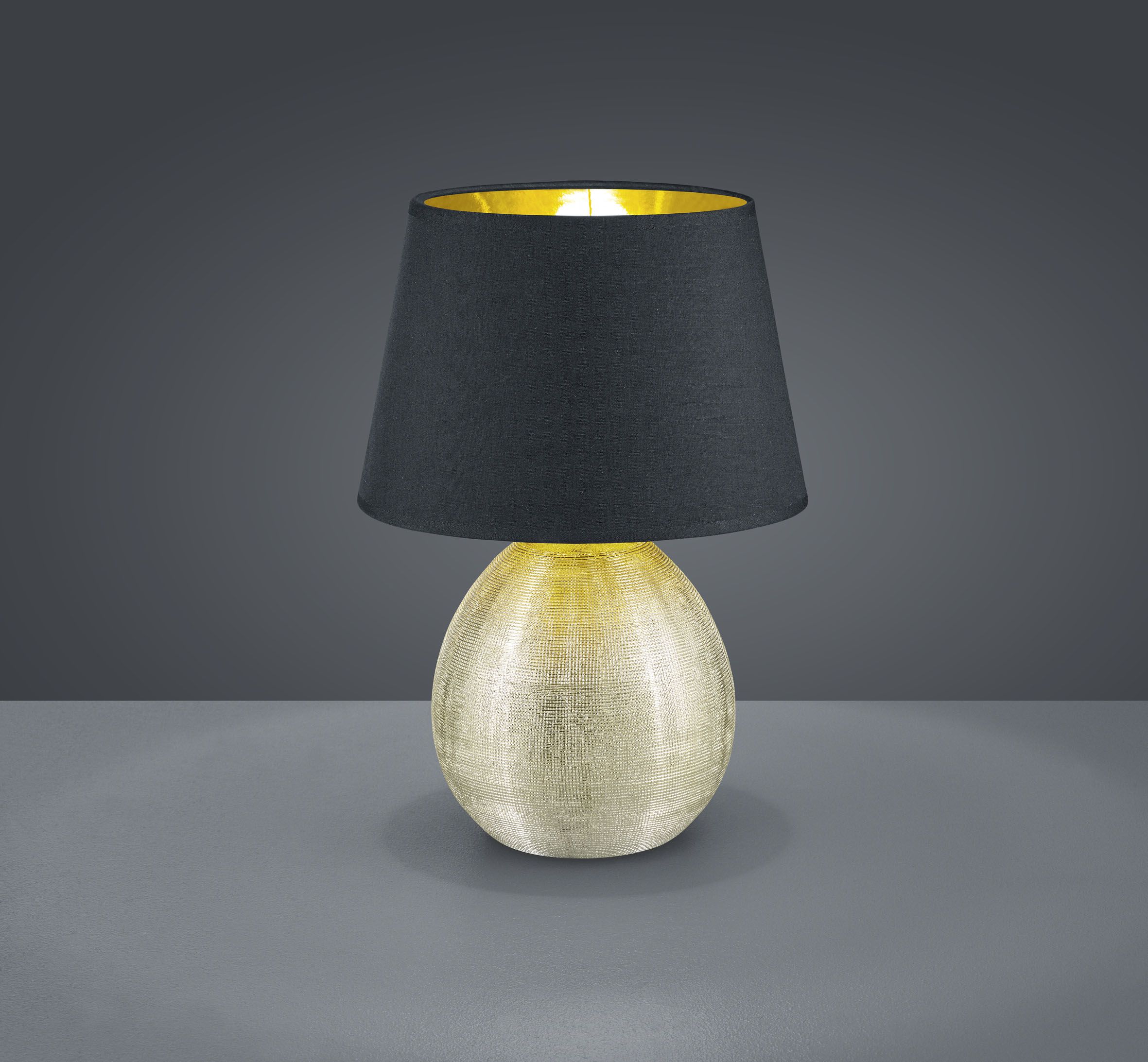 The elegant LUXOR table lamp quickly finds the right place, whether on the sideboard, in the hallway or in the bedroom as an accent light, the modern lamp is a real eye-catcher in any living area. The table lamp with cord switch has a diameter of 24 cm and a height of 35 cm. The gold-coloured ceramic base creates a pleasant ambience and harmonises perfectly with the black fabric shade, which is also gold-coloured on the inside. For energy-saving lighting, it is recommended to use an LED illuminant. These are an optimal alternative to conventional halogen lamps and stand for a high quality of light and energy savings of up to 80%. In addition, LED lamps help you benefit from a long service life, low heat generation and at the same time protect the environment.