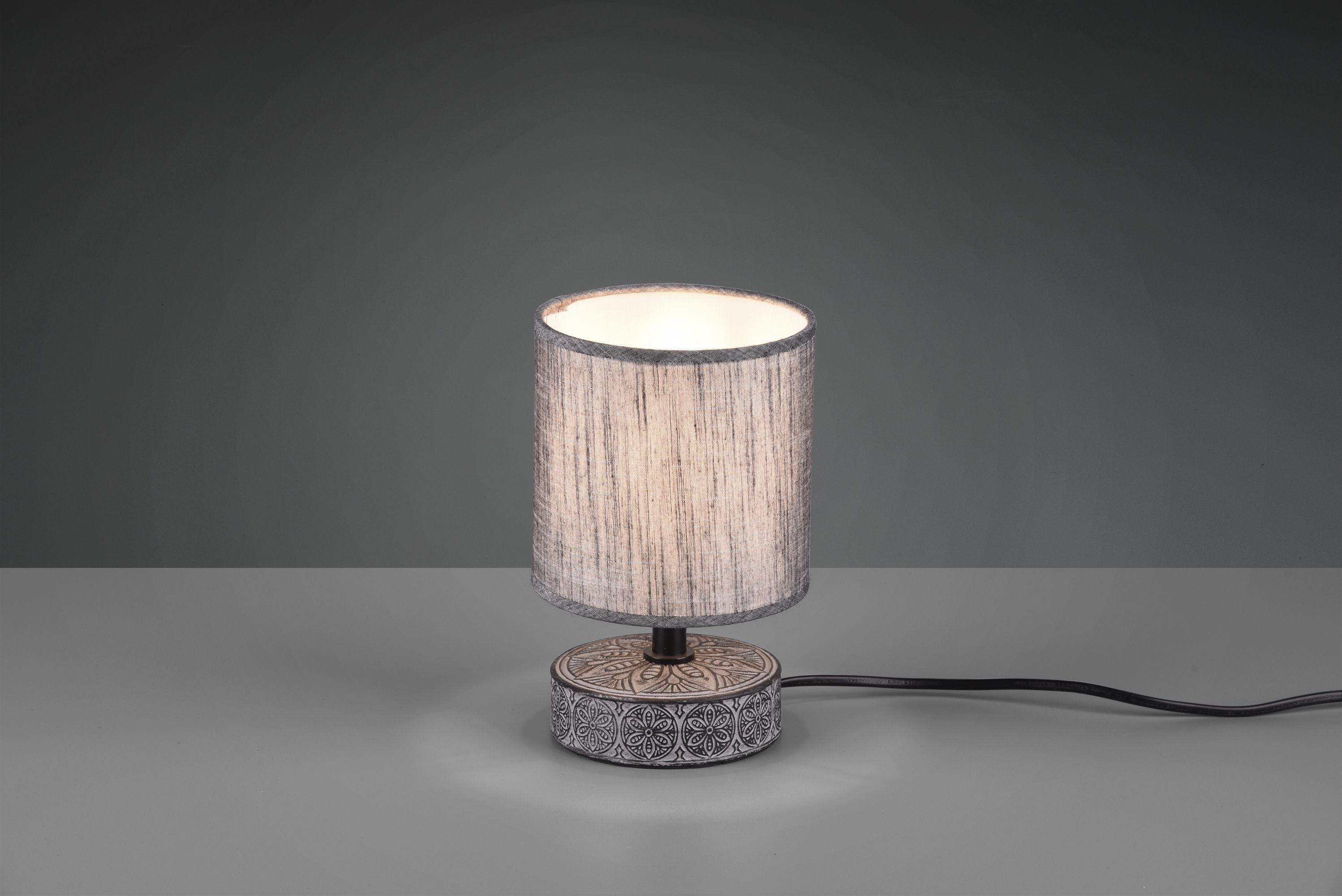 The MARIE table lamp creates a cosy and inviting ambience with its combination of fabric and ceramic. Whether as a bedside lamp in the bedroom, on a chest of drawers or on a side table in the living room, the vintage design makes the lamp an absolute eye-catcher. The light is equipped with a cord switch, making it easy to switch on and off. The light grey design creates an inviting atmosphere and can be combined with other colours. For energy-saving lighting, it is recommended to use an LED illuminant. These are an optimal alternative to conventional halogen lamps and stand for a high quality of light and energy savings of up to 80%. In addition, LED lamps help you benefit from a long service life, low heat generation and at the same time protect the environment.