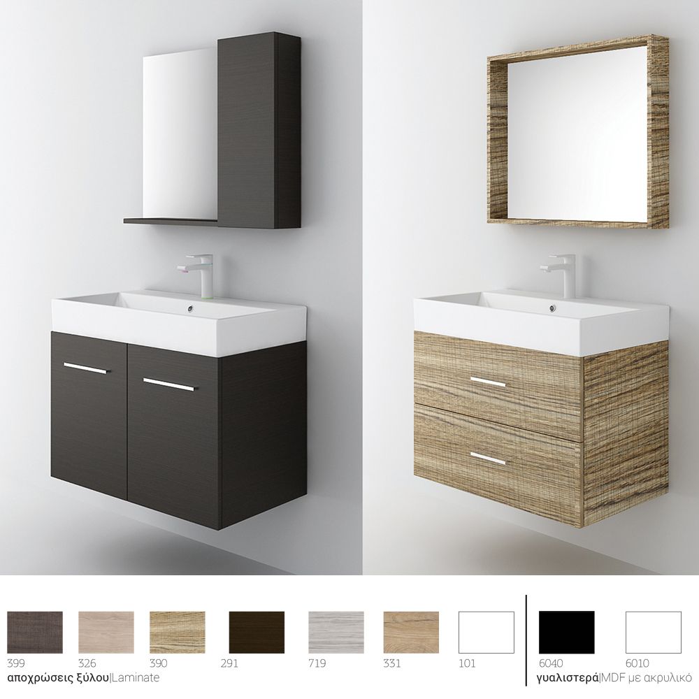 Κρεμαστό έπιπλο μπάνιου Amabile 80 – σειρά επίπλων Minimal. Ένα έπιπλο μπάνιου, βαρέως τύπου ιδανικό για οικιακή χρήση. Αποτελείται από, κρεμαστή βάση με δύο πόρτες ή δύο συρτάρια με μηχανισμούς κλεισίματος soft close και νιπτήρα από πορσελάνη. Μπορείτε να ολοκληρώσετε την εικόνα του επίπλου προσθέτοντας καθρέπτη δικής σας επιλογής (ντουλάπι, εταζέρα με ντουλαπάκια ή καθρέπτη με πλαίσιο) και τα πόμολα που ταιριάζουν στο δικό σας μπάνιο. Όλα τα έπιπλα της εταιρείας Orabella μπορούν να πάρουν στήλες μπάνιου επιδαπέδιες ή κρεμαστές για επιπλέον χώρο αποθήκευσης, ενώ υπάρχει δυνατότητα προσθήκης ντουλαπιού πλυντηρίου σε χρώμα δικής σας επιλογής. Διατίθεται σε έξι διαφορετικές αποχρώσεις ξύλου και σε λευκό χρώμα-Laminate καθώς και σε μαύρο και λευκό γυαλιστερό και ματ ακρυλικό σε mdf. Κατόπιν επιλογής, μπορεί να συνοδευτεί με γραμμικό φωτιστικό μπάνιου Led.