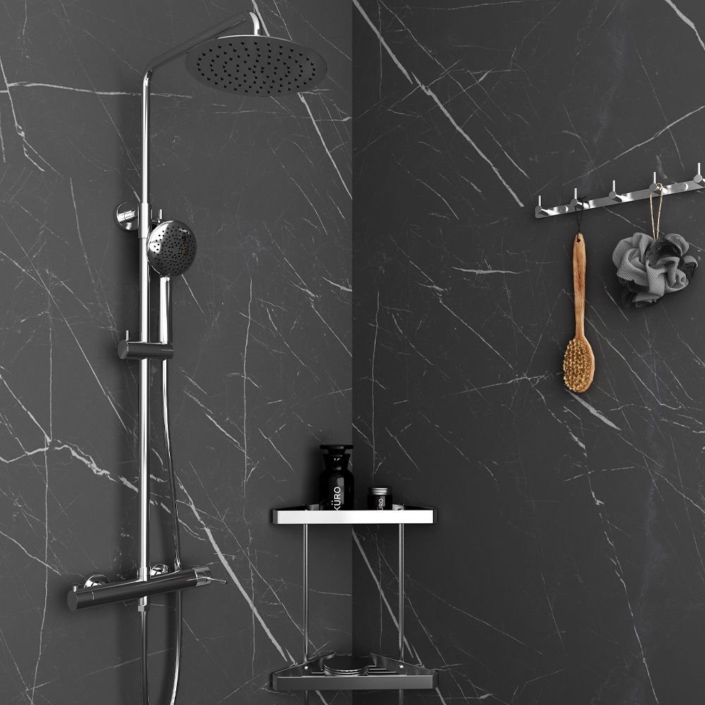 Στήλη ντουζ Elegance Column, ρυθμιζόμενου ύψους (81-118 cm) με κεφαλή από ανοξείδωτο ατσάλι, με ορειχάλκινη μπίλια Φ250. Ο διανομέας είναι κατασκευασμένος εξ ολοκλήρου από υψηλής ποιότητας ορείχαλκο. Συμπεριλαμβάνεται στήριγμά στον τοίχο ABS, τηλέφωνο 5-λειτουργιών και λείο σπιράλ τηλεφώνου (PVC) μήκους 150 εκατοστών. Διατίθεται σε χρωμέ και μαύρο ματ κατόπιν επιλογής.