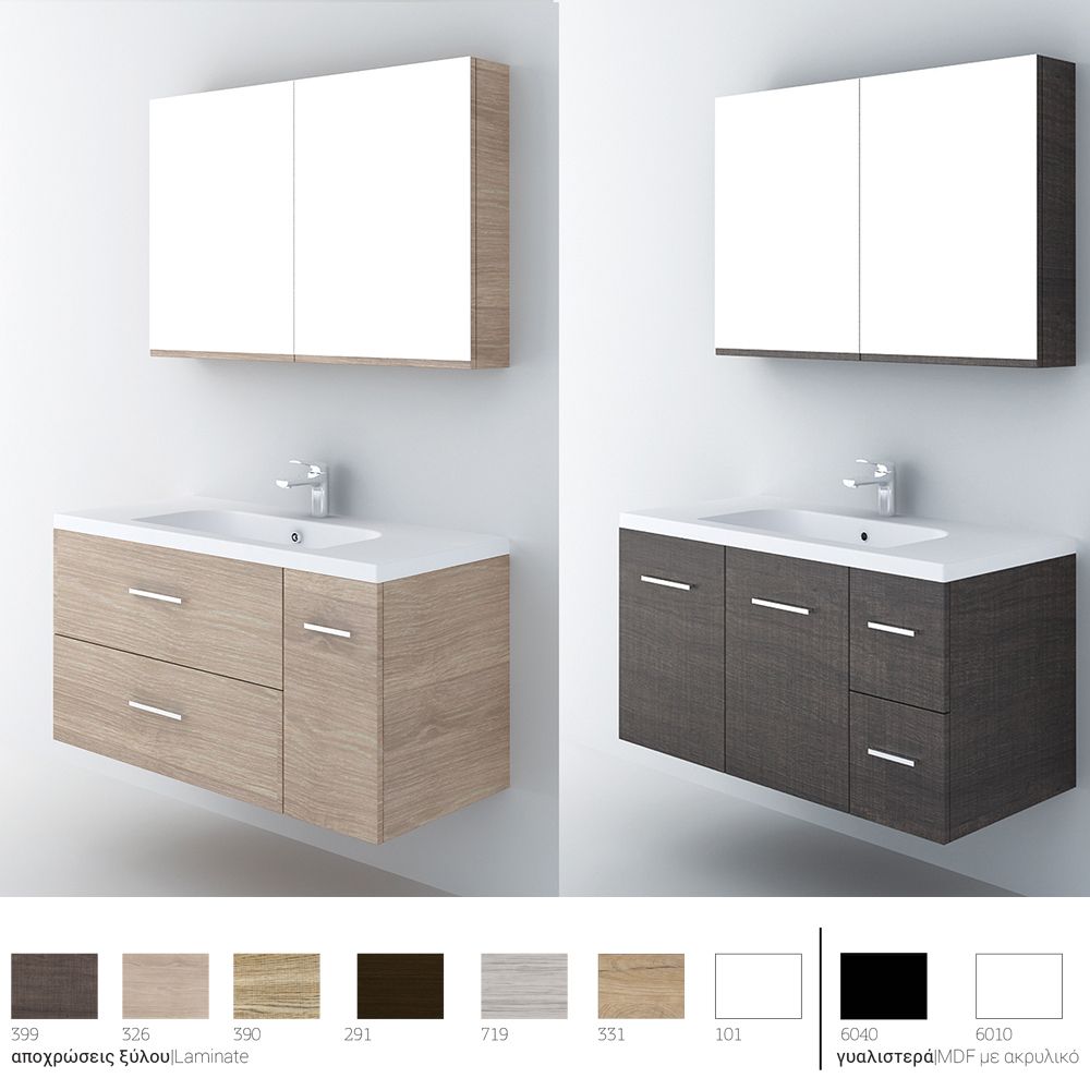 Κρεμαστό έπιπλο μπάνιου Mood 100 – σειρά επίπλων Slim. Ένα έπιπλο μπάνιου, βαρέως τύπου ιδανικό για οικιακή χρήση. Αποτελείται από, κρεμαστή βάση με δύο πόρτες ή δύο πόρτες και δύο συρτάρια ή τέσσερα συρτάρια ή μια πόρτα και δύο συρτάρια, με μηχανισμούς κλεισίματος soft close και νιπτήρα από πορσελάνη. Μπορείτε να ολοκληρώσετε την εικόνα του επίπλου προσθέτοντας καθρέπτη δικής σας επιλογής (ντουλάπι, εταζέρα με ντουλαπάκια ή καθρέπτη με πλαίσιο) και τα πόμολα που ταιριάζουν στο δικό σας μπάνιο. Όλα τα έπιπλα της εταιρείας Orabella μπορούν να πάρουν στήλες μπάνιου επιδαπέδιες ή κρεμαστές για επιπλέον χώρο αποθήκευσης, ενώ υπάρχει δυνατότητα προσθήκης ντουλαπιού πλυντηρίου σε χρώμα δικής σας επιλογής. Διατίθεται σε έξι διαφορετικές αποχρώσεις ξύλου και σε λευκό χρώμα-Laminate καθώς και σε μαύρο και λευκό γυαλιστερό και ματ ακρυλικό σε mdf. Κατόπιν επιλογής, μπορεί να συνοδευτεί με γραμμικό φωτιστικό μπάνιου Led.