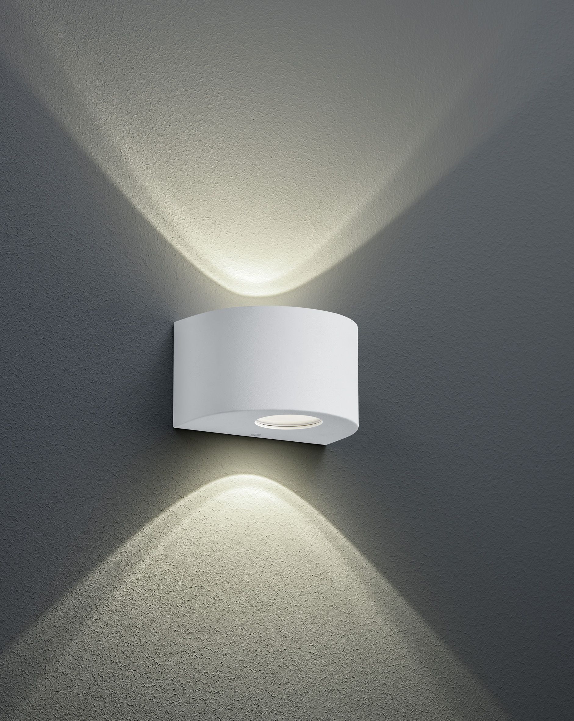Decorative and functional - with its round shape, the ROSARIO wall light offers a stylish appearance and beautifully sets the scene for your outdoor area. The round plastic cover of the up and down lighting filters the light and emits a pleasant light intensity to the surroundings, ensuring that the outdoor area is optimally illuminated. The covers supplied in various designs make the light a real eye-catcher on your wall when switched on. Thanks to the IP44 protection rating, it is suitable for protected outdoor areas. The light has a height of 9 cm, a width of 15 cm and a depth of 10.5 cm. The matt white plastic wall light with an appealing design is an eye-catcher in your outdoor area. The luminaire also features modern LED technology, which is characterised by high light quality and energy efficiency. Compared to conventional halogen light sources, up to 80% of energy costs can be saved. LED light sources also have a long service life, produce less heat and protect the environment.