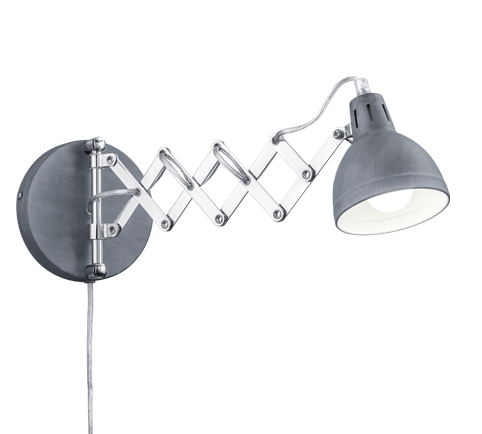 The SCISSOR wall light impresses with its unique design. Thanks to the use of a scissor joint, the light can be used in a variety of ways. It also has a cable feed of approx. 1.5 metres. The lamp arm can be extended to a maximum width of 53 cm. The lamp arm can also be swivelled and the lamp head can be tilted. The combination of chrome with the simple concrete colour allows the light to be combined with many furnishing styles. For energy-saving lighting, it is recommended to use an LED illuminant. These are an optimal alternative to conventional halogen lamps and stand for a high quality of light and energy savings of up to 80%. In addition, LED lamps help you benefit from a long service life, low heat generation and at the same time protect the environment.