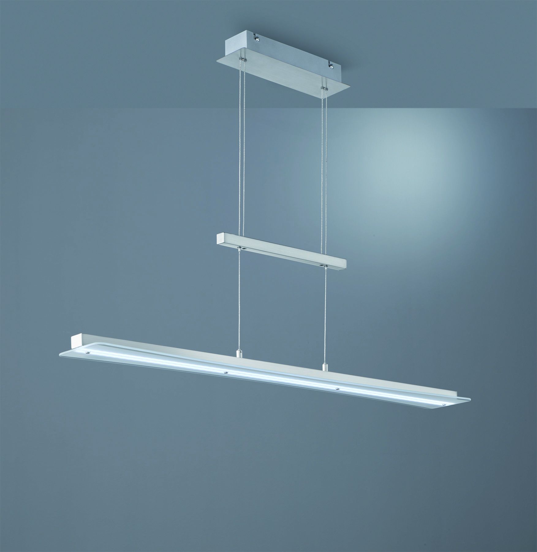 Cosy dining area lighting and a visual highlight. The TRIO SMASH pendant light skilfully sets the scene in your living and dining area without compromising on functionality. The light can be dimmed to three brightness levels using two touch points on the top and the light colour can be gradually adjusted between 3000 and 6500 Kelvin. The SMASH can be used to create a cosy atmosphere or bright dining area lighting, creating a pleasant ambience that invites you to linger or relax. The pendant light measures 100x12cm and can be adjusted in height from 95 to 150cm depending on the intended use. The simple choice of colours and materials in matt nickel allows the pendant to be integrated into a variety of furnishing styles. In addition, the luminaire features modern LED technology, which is characterised by high light quality and energy efficiency. Compared to conventional halogen lamps, up to 80% of energy costs can be saved. In addition, LED light sources have a long service life, produce less heat and protect the environment.