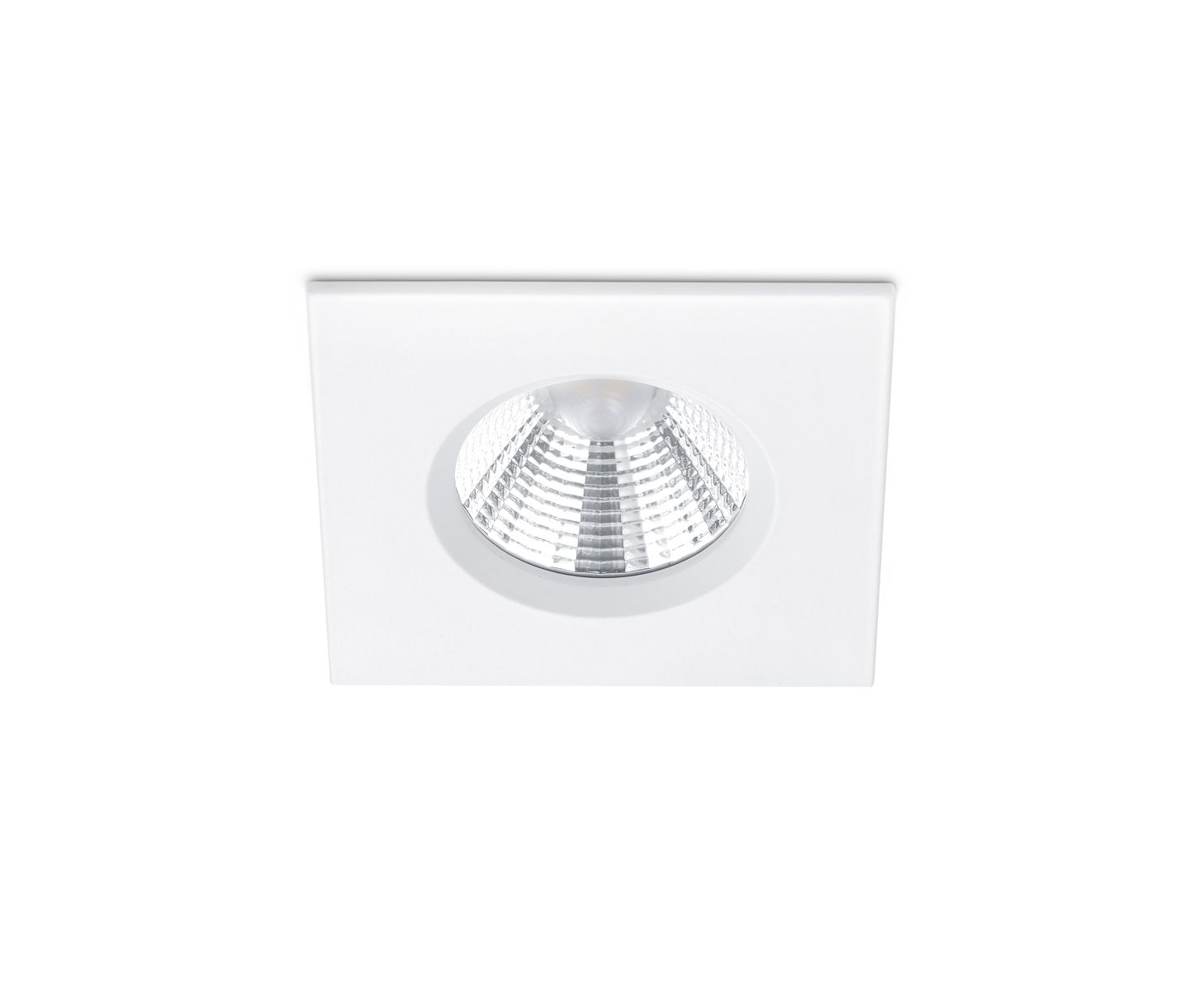 Τετράγωνο χωνευτό σποτ της Trio Lighting από μέταλλο, σε λευκό χρώμα. To ενσωματωμένο LED που διαθέτει εκπέμπει θερμό λευκό φως, το οποίο αποδίδεται στην κλίμακα Kelvin με τιμές από 2400Κ έως 3800Κ. Οι τόνοι του θερμού λευκού είναι πιο κίτρινοι σε σχέση με το φυσικό φως.